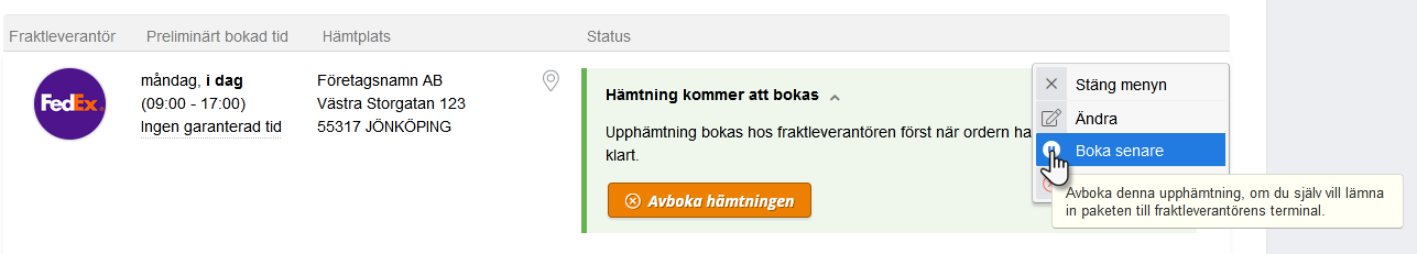 Avboka upphämtningen om du själv vill lämna in paketen till fraktleverantörens terminal.